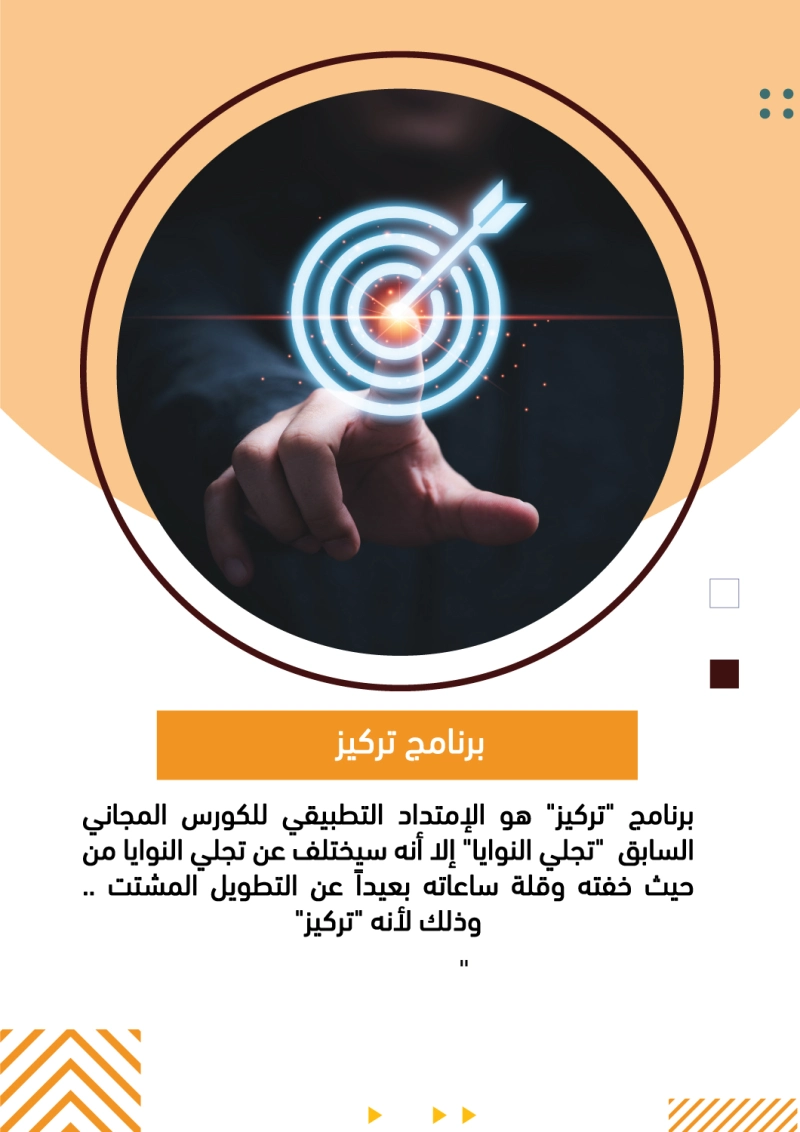 برنامج "تركيز" هو الإمتداد التطبيقي للكورس المجاني السابق "تجلي النوايا" إلا أنه سيختلف عن تجلي النوايا من حيث خفته وقلة ساعاته بعيداً عن التطويل المشتت .. وذلك لأنه "تركيز"